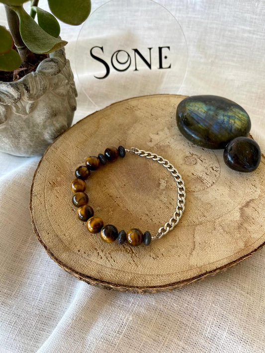 Bracelet Mix - Oeil de tigre, Pierre de lave et chaine